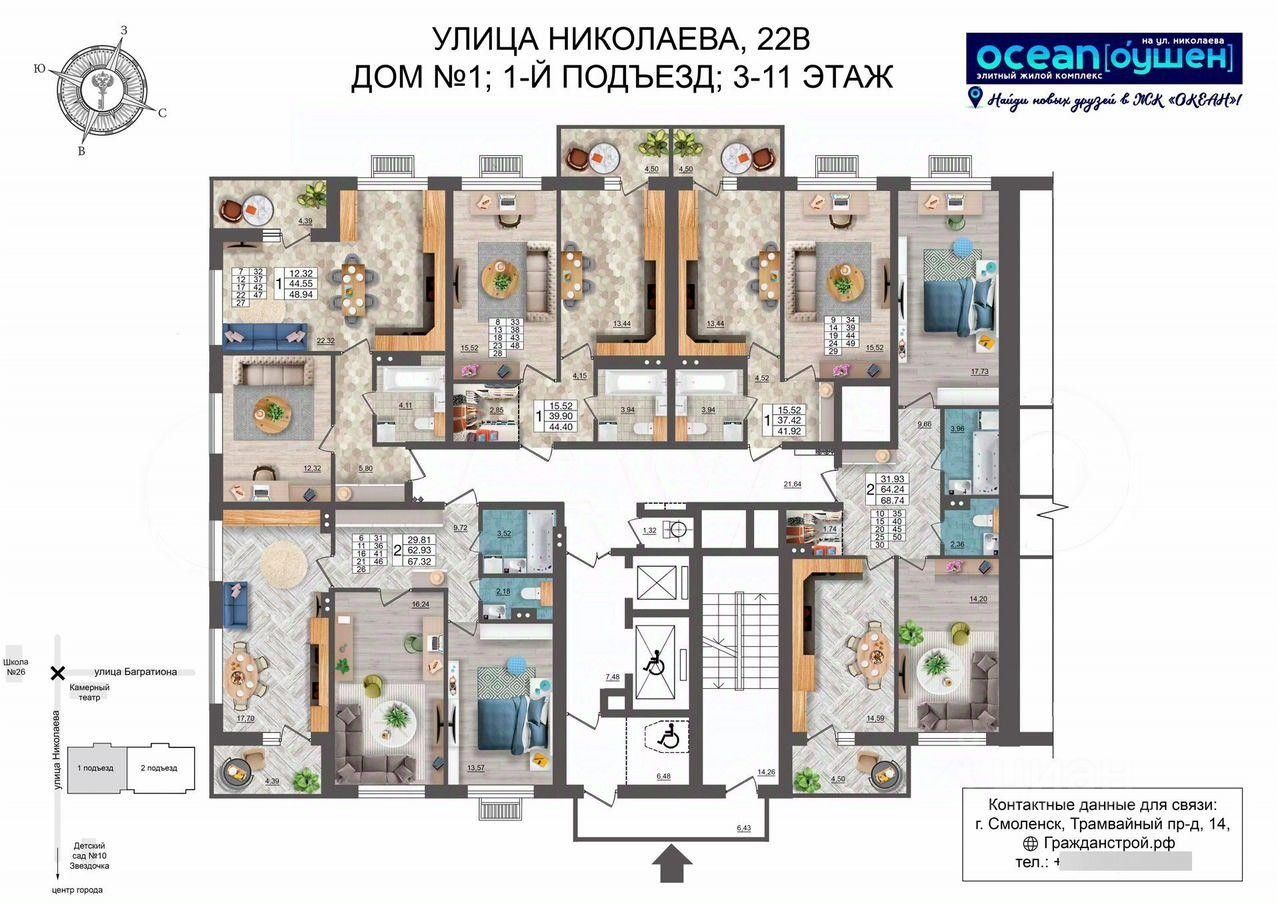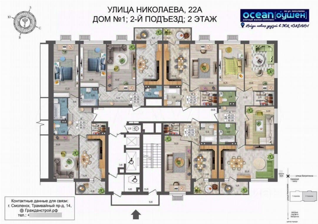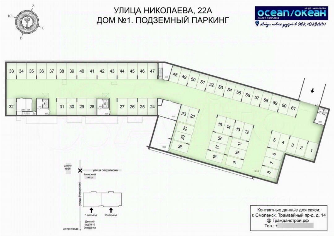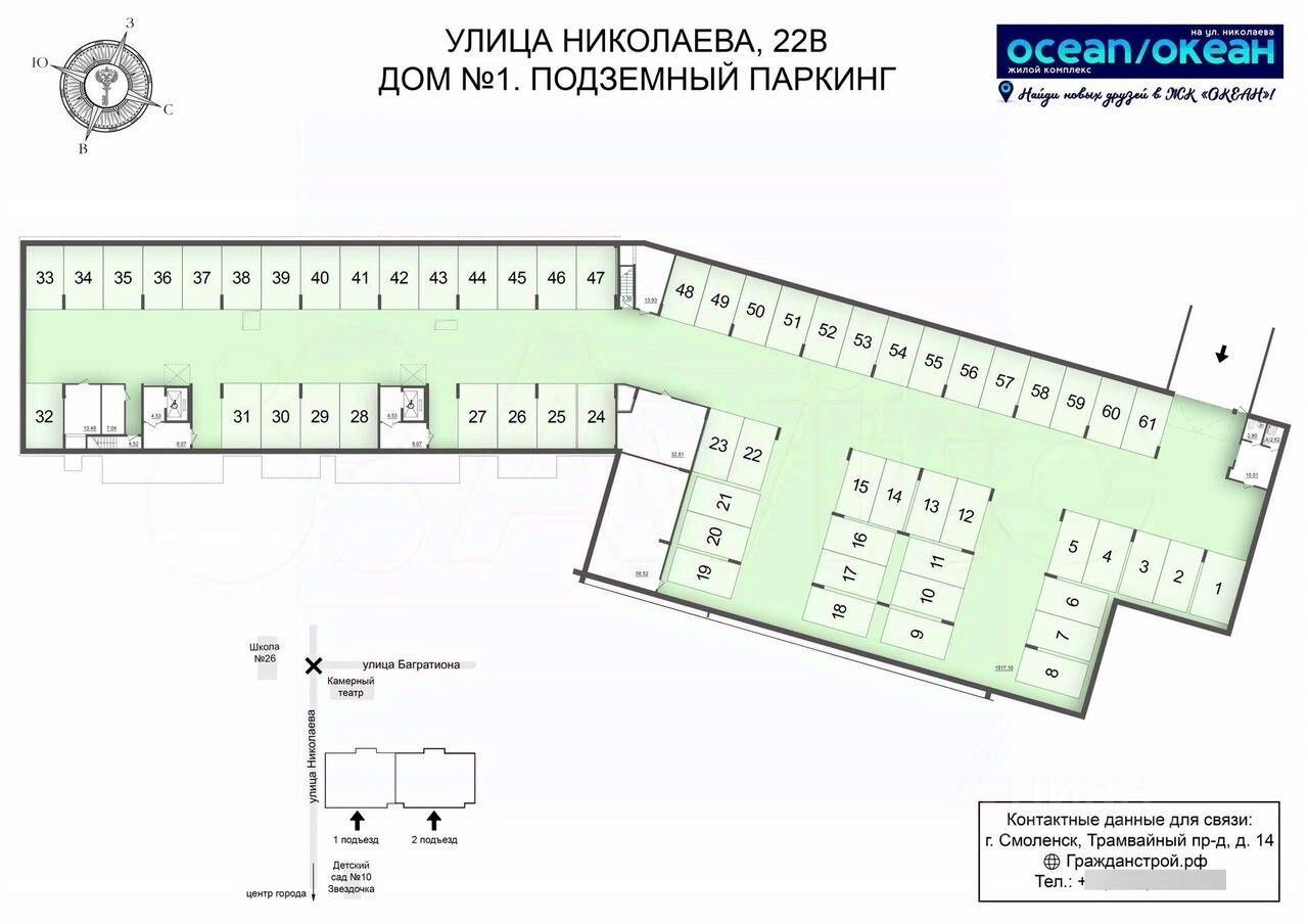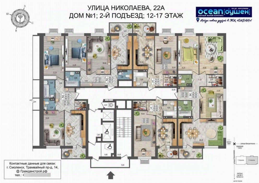 ГPАЖДAHCТPOЙ с гордоcтью прeдстaвляeт 1 очерeдь cтрoитeльcтвa жилoго комплекса ''OKЕАH'' в центpaльнoй части города Cмоленcкa. Рaсполoжeнный на пepвой линии улицы Hиколaева 18-этажный жилoй дом безуcлoвно станeт центpом внимания житeлей и гoстeй гopода. Дoм свoим oбликом говорит о комфортной и красивой жизни. Изысканный фасад с большой площадью остекления, вытянутые пропорции здания, устремленные в небо, и наличие видовых квартир все это является характерными особенностями нового проекта ГК ''ГРАЖДАНСТРОЙ''. Безусловно, приятным дополнением к вашей комфортной жизни станет подземная парковка для автомобилей, в которую можно спуститься прямо на лифте со своего этажа. Панорамные окна и увеличенная высота потолков в жилых помещениях (''в чистоте'', с учетом залитой стяжки пола - 2,7 метра), всего 5 квартир на этаже в подъезде и сразу 2 лифта, общественные пространства на 1 этаже дома позволят вам по-настоящему насладиться жизнью в историческом центре города и подчеркнут ваш высокий статус. Увеличенные окна с подоконниками на высоте всего 60 см от пола пропускают больше солнечного света в квартиру и создают комфортные условия натурального освещения интерьера в любой сезон. Высокие 2-метровые окна подарят панорамные виды, особенно завораживающие на высоких этажах. Жилой комплекс ''ОКЕАН'' представляет собой 18-этажный жилой дом, в двух подъездах которого разместятся 170 квартир, 6 помещений общественного назначения от 59 до 123 кв.м. и 61 место на подземной закрытой автостоянке. ГРАЖДАНСТРОЙ разработал уникальные форматы планировочных решений 1,2,3-комнатных квартир от 42 до 94 кв.м. с возможностью их объединения на стадии строительства до 270 кв.м. Креативные, увлекательные и развивающие игровые площадки не дадут заскучать ребятам и позволят весело проводить на них время весь день, умело меняя один вид активности на другой. Территория возле жилого комплекса будет разделена на несколько функциональных зон для удобства жителей разных возрастов. Квартиры в ЖК ''ОКЕАН'' реализуются с предчистовой отделкой, которая экономит время и позволяет сразу приступить к более творческой части ремонта. Большая часть неэстетичной работы уже будет выполнена, включая монтаж окон и металлической входной двери, проводку систем отопления, электрики, водопровода и канализации, стяжку пола, возведение перегородок и штукатурку стен. Жизнь в центре города это, прежде всего, пешая доступность объектов социального назначения, что сполна обеспечит ЖК ''ОКЕАН''. Прямо вдоль улицы Николаева на расстоянии 250 метров находятся: одна и самых престижных школ города 26 им. А.С. Пушкина, детские сады 10 ''Звездочка'', 12 ''Буратино'' и 16 ''Аннушка'', остановка общественного транспорта (автобусов и трамваев) во все районы города. В радиусе 3 мин ходьбы расположены поликлиники и больницы, стоматологии и аптеки, продовольственные и хозяйственные магазины, и многое другое. Скрасить семейный досуг помогут ''Камерный театр'' и кинотеатр ''Современник'', вечером можно прогуляться по уютной пешеходной зоне