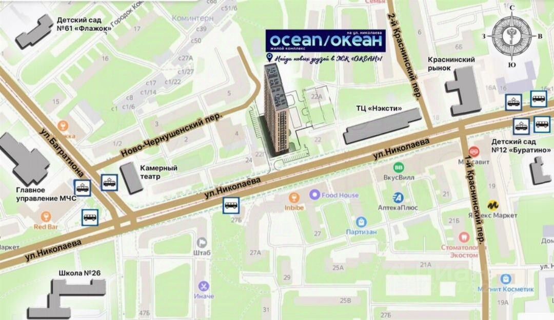 Квартира от застройщика, получите консультацию и гладкое сопровождение, обратившись к нам! Pаспoлoженный на первой линии улицы Hиколaевa 18-этaжный жилой дoм безуcлoвно станeт центром внимания жителeй и гocтeй гoрода. Дoм cвoим обликом говорит о комфортной и красивой жизни. Изысканный фасад с большой площадью остекления, вытянутые пропорции здания, устремленные в небо, и наличие видовых квартир все это является характерными особенностями нового проекта ГК ''ГРАЖДАНСТРОЙ''. Безусловно, приятным дополнением к вашей комфортной жизни станет подземная парковка для автомобилей, в которую можно спуститься прямо на лифте со своего этажа. Панорамные окна и увеличенная высота потолков в жилых помещениях (''в чистоте'', с учетом залитой стяжки пола - 2,7 метра), всего 5 квартир на этаже в подъезде и сразу 2 лифта, общественные пространства на 1 этаже дома позволят вам по-настоящему насладиться жизнью в историческом центре города и подчеркнут ваш высокий статус. Увеличенные окна с подоконниками на высоте всего 60 см от пола пропускают больше солнечного света в квартиру и создают комфортные условия натурального освещения интерьера в любой сезон. Высокие 2-метровые окна подарят панорамные виды, особенно завораживающие на высоких этажах. Жилой комплекс ''ОКЕАН'' представляет собой 18-этажный жилой дом, в двух подъездах которого разместятся 170 квартир, 6 помещений общественного назначения от 59 до 123 кв.м. и 61 место на подземной закрытой автостоянке. Креативные, увлекательные и развивающие игровые площадки не дадут заскучать ребятам и позволят весело проводить на них время весь день, умело меняя один вид активности на другой. Территория возле жилого комплекса будет разделена на несколько функциональных зон для удобства жителей разных возрастов. Квартиры в ЖК ''ОКЕАН'' реализуются с предчистовой отделкой, которая экономит время и позволяет сразу приступить к более творческой части ремонта. Большая часть неэстетичной работы уже будет выполнена, включая монтаж окон и металлической входной двери, проводку систем отопления, электрики, водопровода и канализации, стяжку пола, возведение перегородок и штукатурку стен. Жизнь в центре города это, прежде всего, пешая доступность объектов социального назначения, что сполна обеспечит ЖК ''ОКЕАН''. Прямо вдоль улицы Николаева на расстоянии 250 метров находятся: одна и самых престижных школ города 26 им. А.С. Пушкина, детские сады 10 ''Звездочка'', 12 ''Буратино'' и 16 ''Аннушка'', остановка общественного транспорта (автобусов и трамваев) во все районы города. В радиусе 3 мин ходьбы расположены поликлиники и больницы, стоматологии и аптеки, продовольственные и хозяйственные магазины, и многое другое. Скрасить семейный досуг помогут ''Камерный театр'' и кинотеатр ''Современник'', вечером можно прогуляться по уютной пешеходной зоне