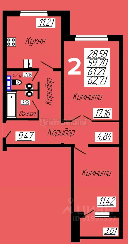продам 2-к, Центральная, 64 390 000 ₽