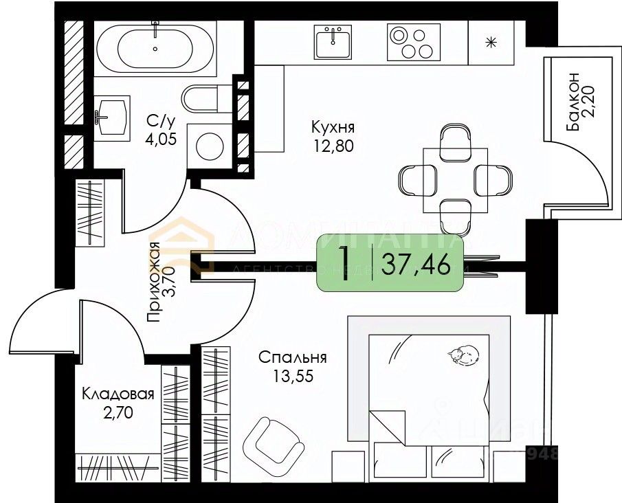 • Общая площадь: 38.34 кв.м • Жилая зона: 13.55 кв.м (изолированная планировка) • Площадь просторной кухни: 12.8 кв.м, идеально подходящей для кулинарных экспериментов и семейных ужинов • Высота потолков: 2.