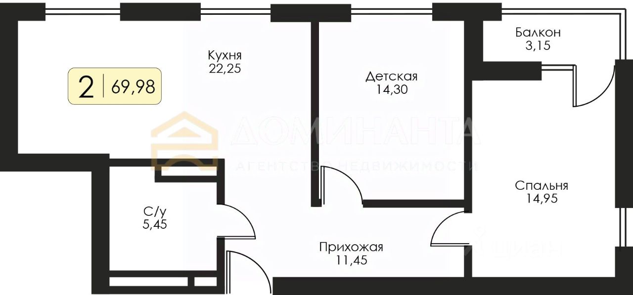 • Общая площадь: 69.98 кв.м • Две изолированные комнаты общей площадью 29.25 кв.м, позволяющие создать функциональное пространство для каждого члена семьи • Большая кухня размером 22.25 кв.м, удобная для приёма гостей и семейного отдыха • Высокие потолки высотой 2.