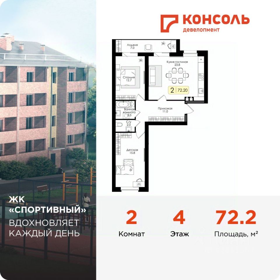 Продается двухкомнатная квартира 48 с черновой отделкой в ЖК ''Спортивный'' площадью 72.2 на 4 этаже от застройщика Консоль девелопмент.