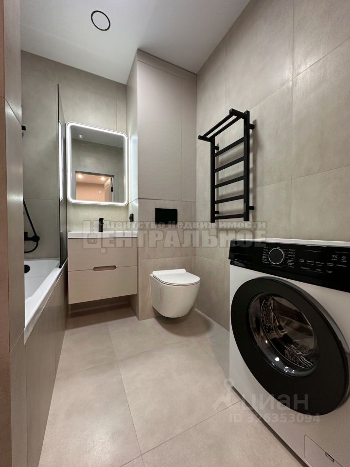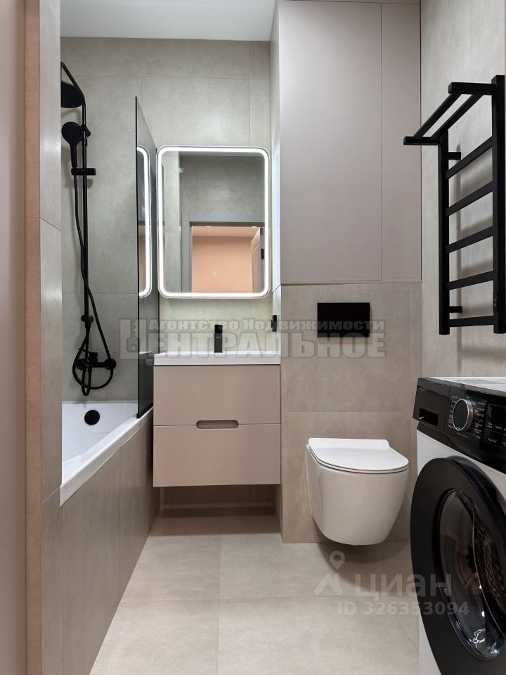 Санузел: - Большая ванна с перегородкой, - Теплые полы, - Зеркало - шкаф с подсветкой, - Инсталляция, -Шкаф над инсталляцией и шкаф под хозяйственные нужды, -Тропический душ - Смесители am pm -Стиральная машина