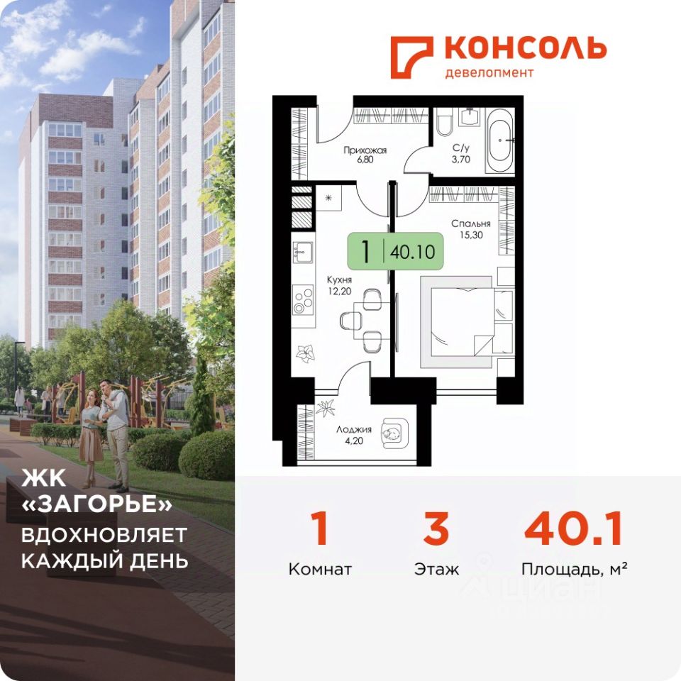 Продается однокомнатная квартира 62 с черновой отделкой в ЖК ''Загорье'' площадью 40.1 на 3 этаже от застройщика Консоль девелопмент.