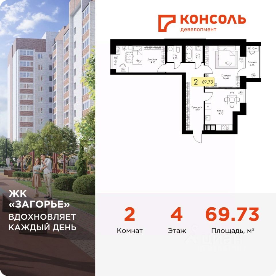 Продается двухкомнатная квартира 124 с черновой отделкой в ЖК ''Загорье'' площадью 69.73 на 4 этаже от застройщика Консоль девелопмент.