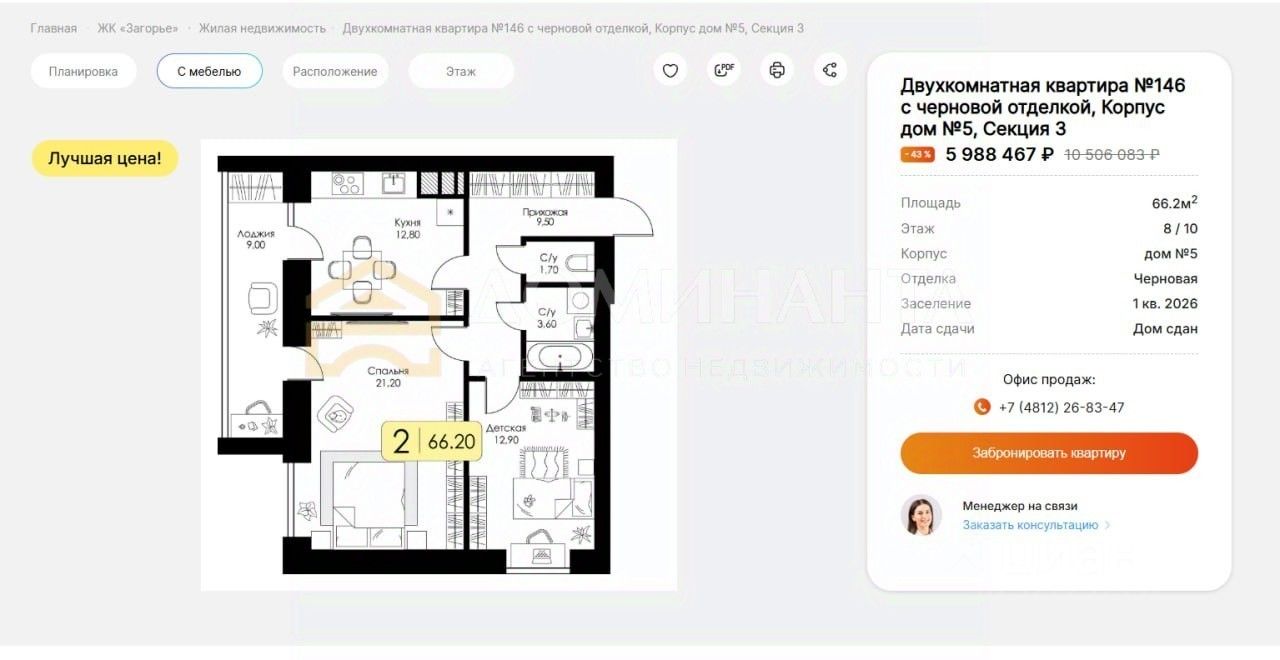 • Двухкомнатная квартира с изолированными комнатами общей площадью 66.2 кв.м. • Высота потолков: 2.7 метра, создавая ощущение дополнительного объема и воздушности пространства. • Живописный вид из окон на ухоженные городские улицы. • Просторная и функциональная планировка: два отдельных жилых помещения, кухню площадью 12.8 кв.м и раздельный санузел. • Современная инфраструктура жилого комплекса включает детскую площадку, спортивную зону и открытую парковку во дворе.